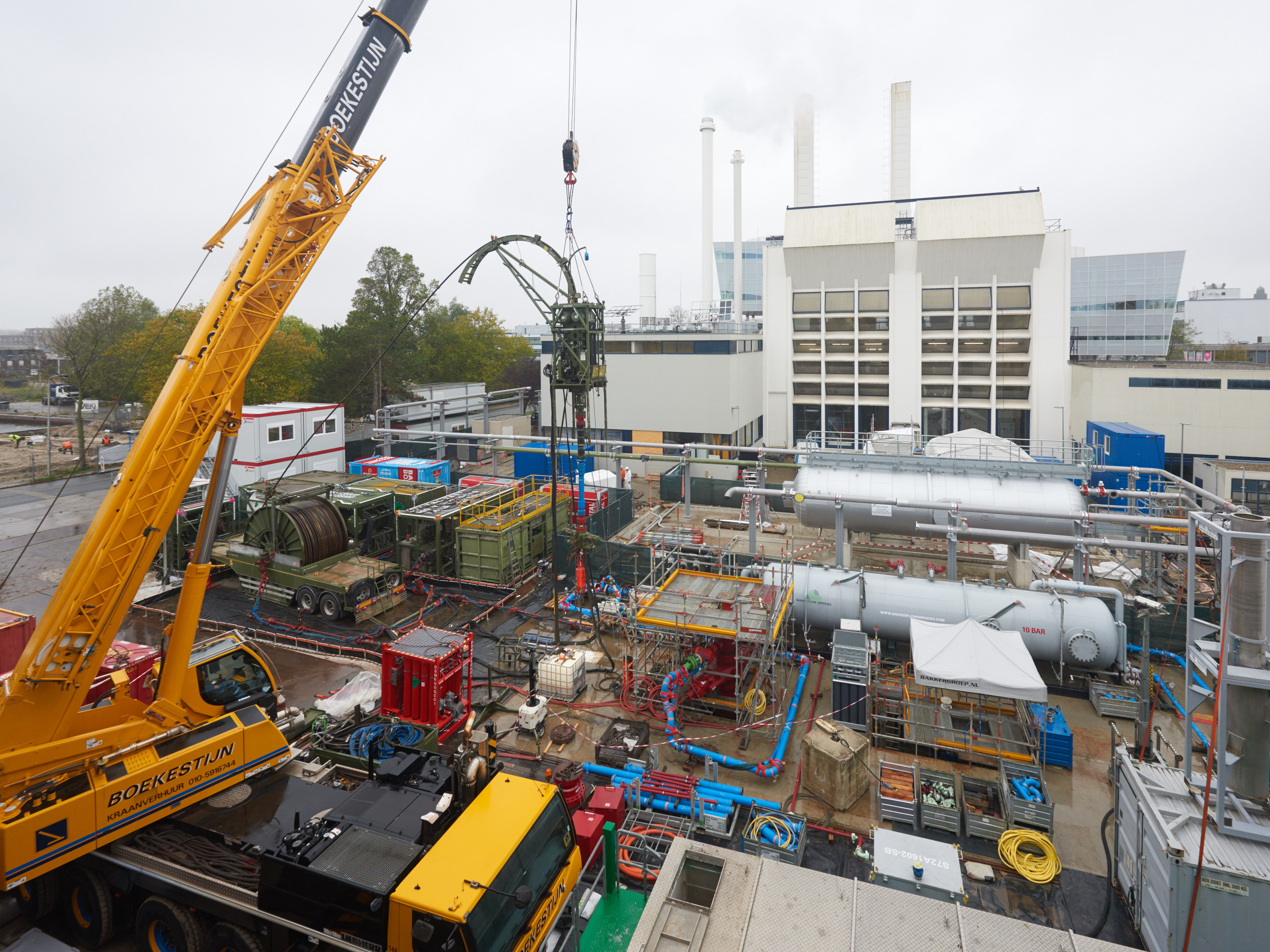 Meest in het oog springt de grote gele kraan. Daarmee wordt gewerkt aan de injectie- en de productieput van de aardwarmtebron. Die werkzaamheden vinden plaats tegelijkertijd met werk op andere plekken. Zo is er op het terrein een inkoopstation geplaatst, dat ervoor zorgt dat GTD straks op het stroomnet kan worden aangesloten. Ook wordt er in de WarmteKrachtCentrale doorgewerkt aan de gebouw gebonden installaties. En is er de afgelopen week een flinke stap gezet in de fundatie van het grote buffervat in de WarmtePompCentrale.